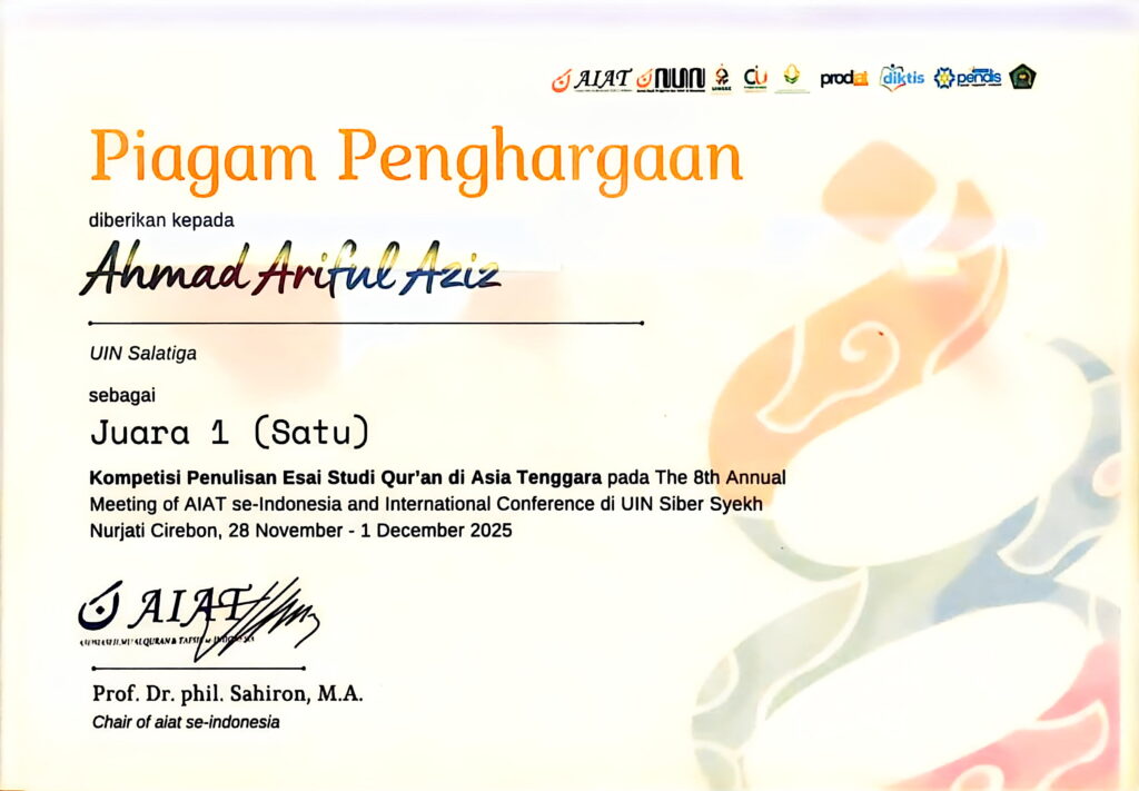 SALATIGA – Prestasi membanggakan kembali datang dari kancah internasional. Ahmad Ariful Aziz, mahasiswa program studi Ilmu Al-Qur’an dan Tafsir (IAT) pada Fakultas Ushuluddin, Adab, dan Humaniora (FUADAH) UIN Salatiga, sukses mengukir sejarah dengan meraih Juara 1 Kompetisi Penulisan Esai Qur’an di Asia Tenggara.